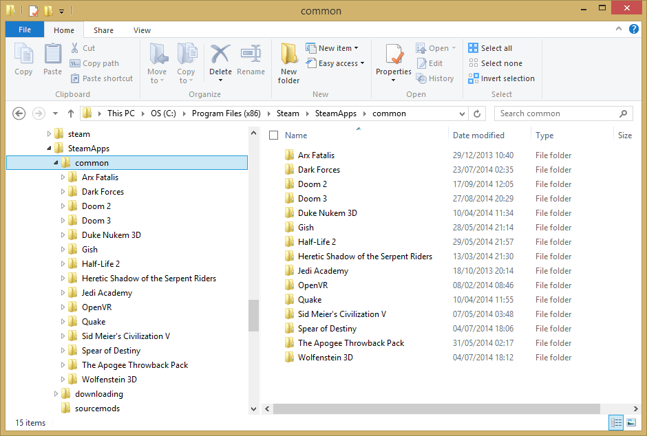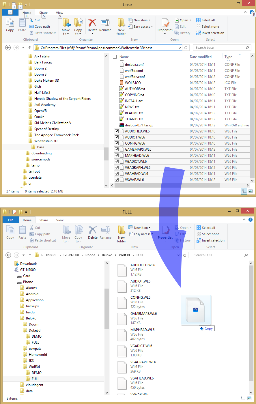 5. Now copy the files from the Steam folder to the device. Note the required files may be inside another folder in the Steam folder, for example they are in 'base' in the Wolfenstine 3D folder.