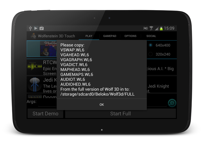 3. On your device launch the app and press the 'Start Full' button. A message will appear telling you which files you need, and which folder on the device to copy them to: